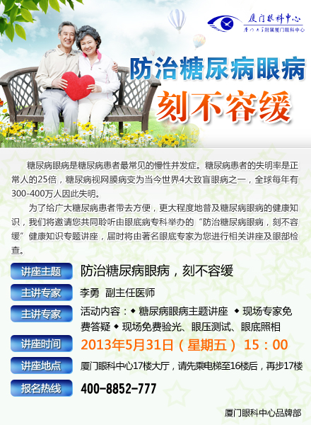 【文章導(dǎo)讀】【名醫(yī)講堂糖尿病眼病防治】5月31日,本周五,糖尿病眼病防治講堂將在廈門(mén)眼科中心17樓開(kāi)講,所有受糖尿病眼病疾病困擾的患者,均可來(lái)參與聽(tīng)講,期間也會(huì)免費(fèi)為所有人免費(fèi)驗(yàn)光、