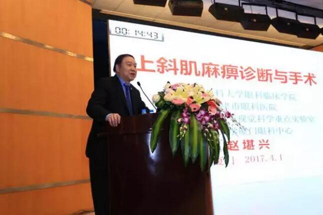 眼科醫(yī)院集團(tuán)專家委員會主席趙堪興教授帶來了題為《上斜肌麻痹診斷與手術(shù)》的主題演講。趙教授深入淺出的向大家介紹了SOP的7種臨床分型,并認(rèn)為在治療過程中需根據(jù)臨床發(fā)展階段、分型,選擇治療方式。趙教授表示垂直、旋轉(zhuǎn)肌肉手術(shù)的非共同性結(jié)果非常明顯,在實施手術(shù)肌肉的功能位上效果最大,其它注視位矯正效果遞減。