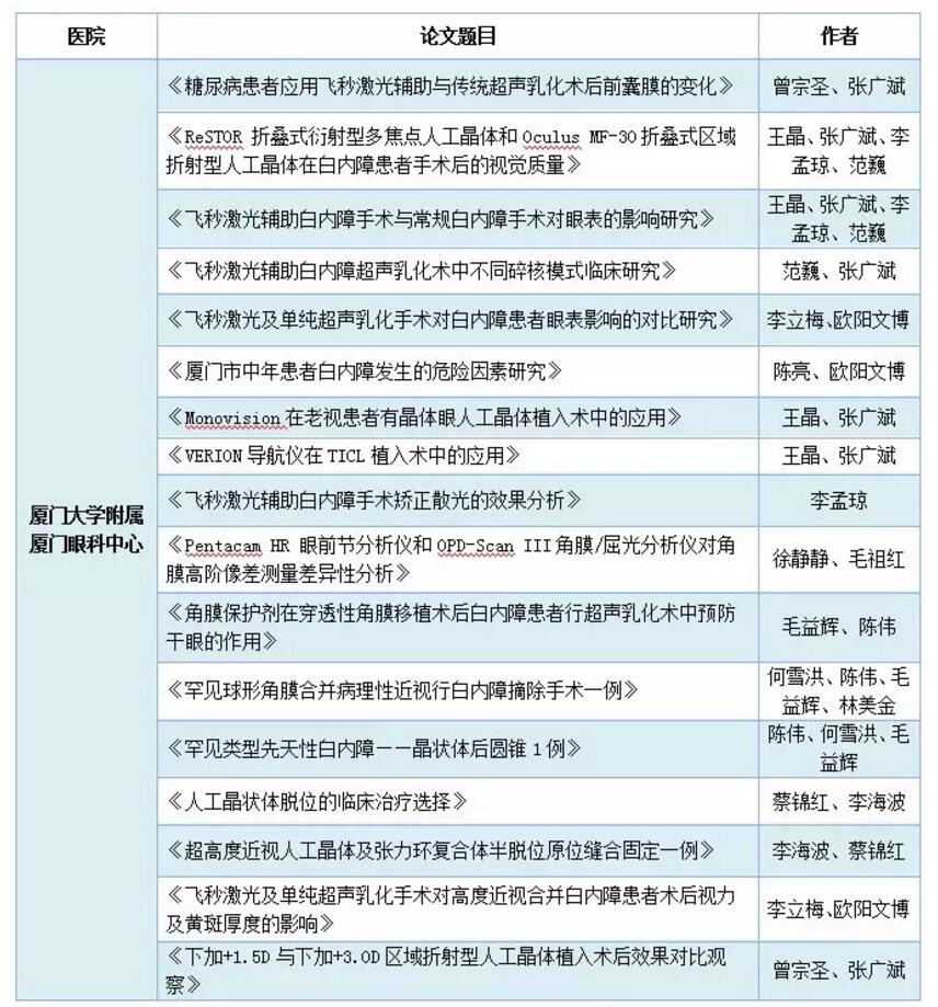 廈門眼科中心白內(nèi)障??品段?lái)《飛秒激光治療白內(nèi)障合并Fuchs角膜內(nèi)皮營(yíng)養(yǎng)不良術(shù)后療效觀察》、《白內(nèi)障超聲乳化聯(lián)合piggyback人工晶體植入術(shù)在高度遠(yuǎn)視白內(nèi)障中療效分析》
