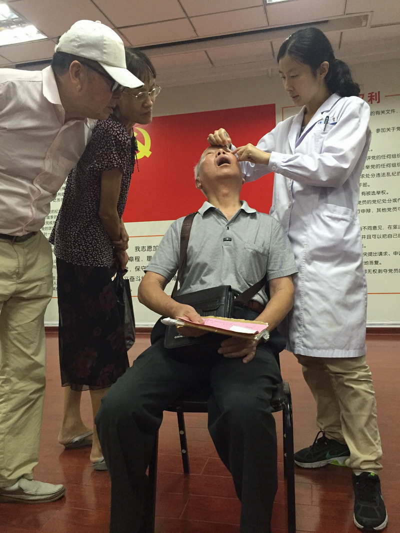 毛祖紅醫(yī)生用裂隙燈現(xiàn)場患者檢查眼壓、驗(yàn)光
