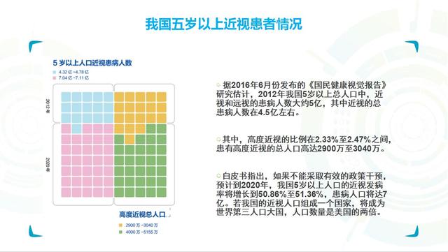 這個白皮書還告訴我們,如果不能夠及時采取有效的干預措施,到2020年的時候,我們國家5歲以上的人口近視發(fā)病率將進一步增長到51%或者還要多一點。那么這個人口就不再是5億了,就接近7個億。這個數字很嚇人,是美國現(xiàn)有人口的兩倍。