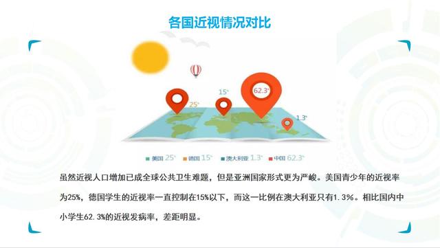 我們跟同期其他國家做了比較,美國青少年的近視率只有四分之一,而德國的近視率一直控制在15%以下,澳大利亞只占1.3%。所以這個差距就是我們今后努力的方向。