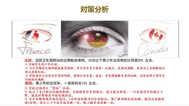 在法國,第一條就是重視戶外活動,然后中小學都減少他的課堂時間,然后要確定必須定期進行視力檢查。如果發(fā)現(xiàn)近視,要求立即配鏡,以減少加深度數。另外在膳食上不能挑食。