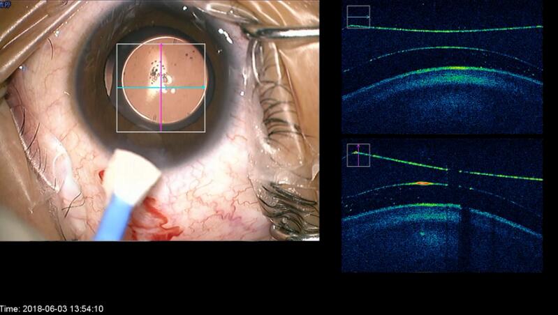 廈門大學(xué)附屬廈門眼科中心總院長黎曉新教授已使用該術(shù)中OCT完成了不少眼底手術(shù),她以黃斑手術(shù)為例介紹說,作為視網(wǎng)膜重要的結(jié)構(gòu),黃斑手術(shù)的精密度要求非常高。在黃斑裂孔手術(shù)中,術(shù)中OCT可以實(shí)時監(jiān)控整個過程,核心步驟完成,可以立即掃描,觀察OCT來評估手術(shù)作用,預(yù)測術(shù)后恢復(fù),對于手術(shù)起到重大的保障和提高,使得手術(shù)質(zhì)量得到跨越式地提升。