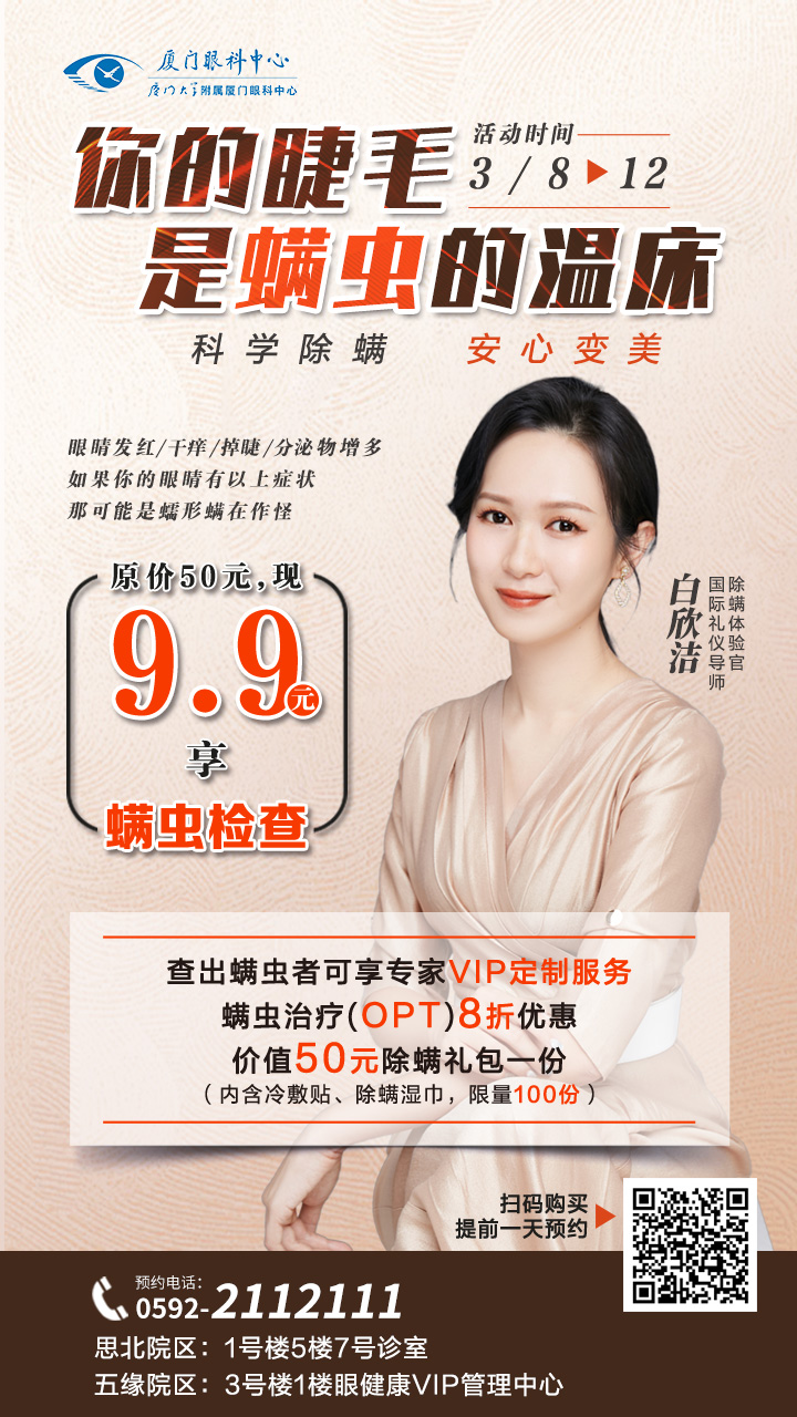 廈門眼科中心干眼中心每年接診近萬例蠕形螨感染患者,中心由中國眼科界工程院院士謝立信教授、亞洲干眼協(xié)會主席劉祖國教授、廈門眼科中心眼表及角膜病??浦魅巍W(xué)科帶頭人吳護(hù)平教授領(lǐng)銜,廈門眼科中心眼表及角膜病??贫辔会t(yī)生協(xié)同合作,為患者提供眼部熏蒸SPA、瞼板腺按摩、OPT脈沖激光等諸多解決方案,為廣大患者帶來科學(xué)、專業(yè)的一站式治療體驗(yàn)。
