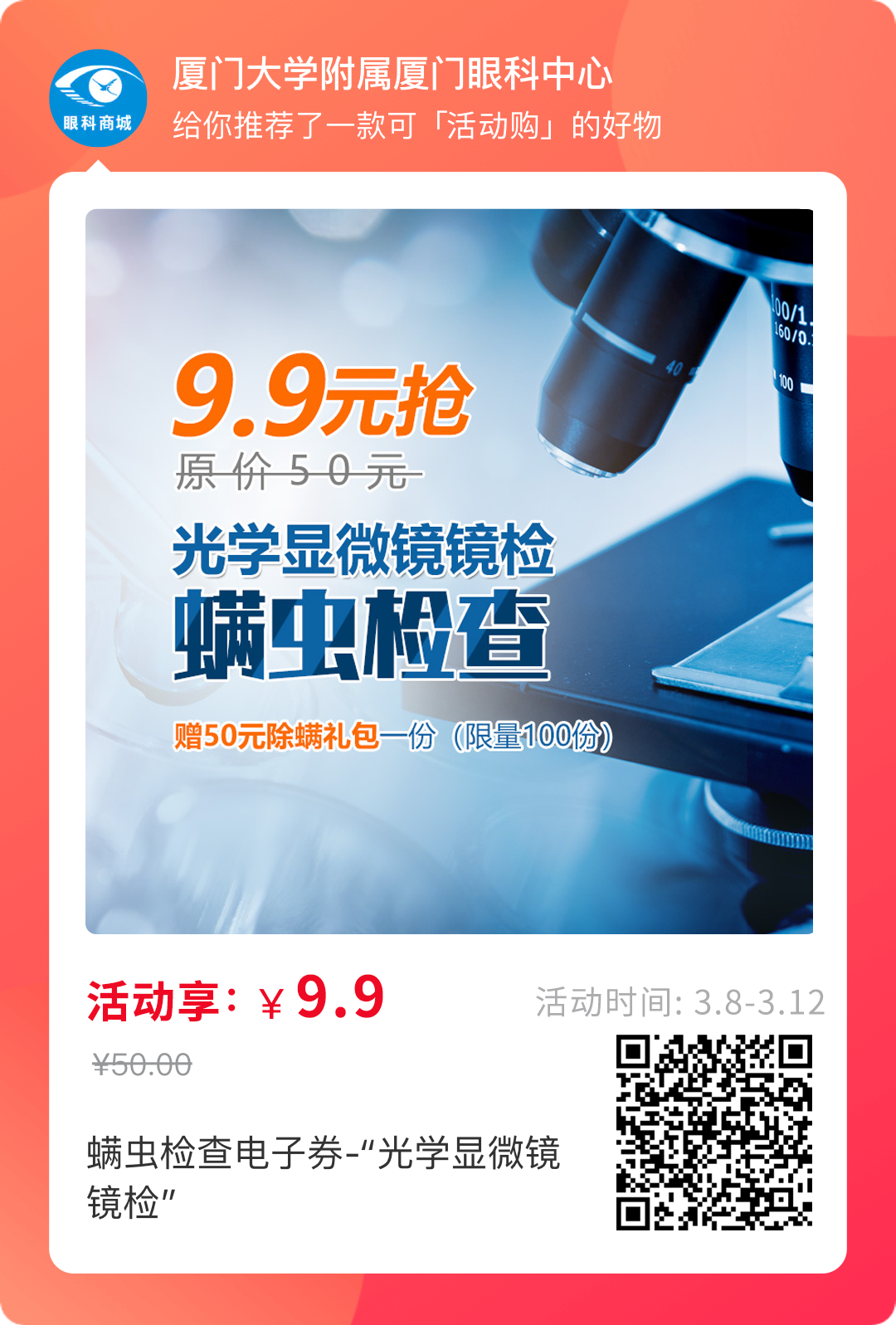 1、9.9元享50元“光學(xué)顯微鏡鏡檢”螨蟲檢查;