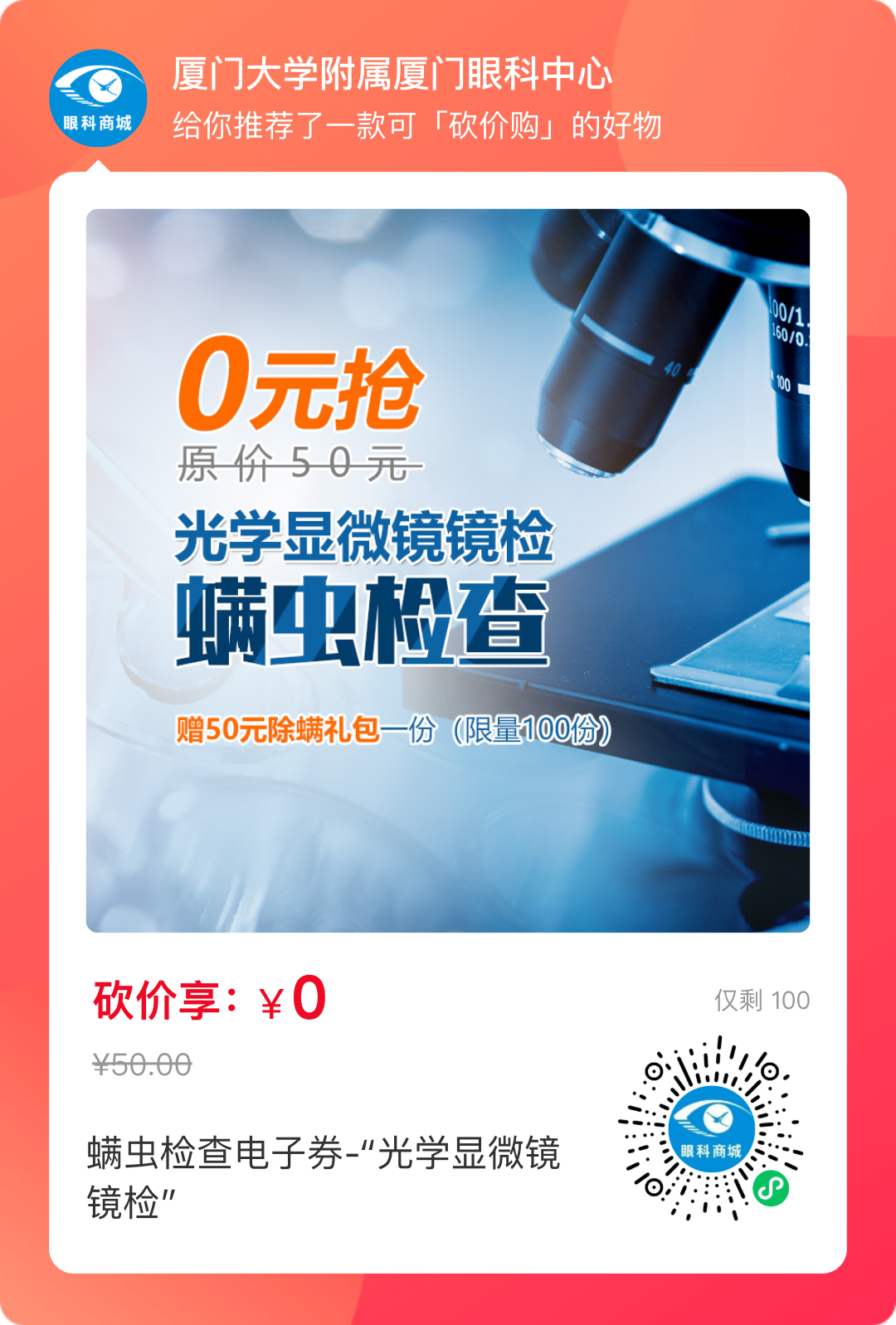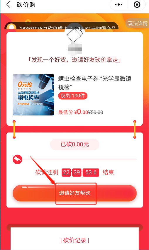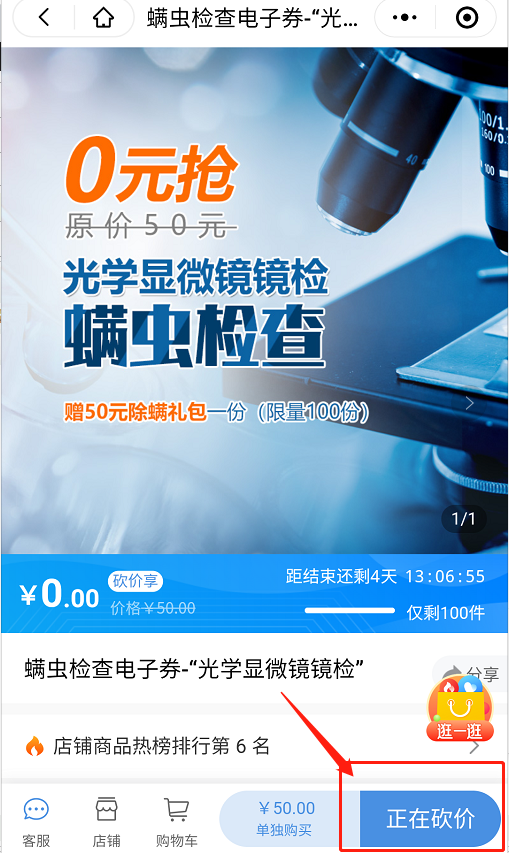 2、邀請10位好友助力砍價(jià),即可0元享螨蟲鏡檢。