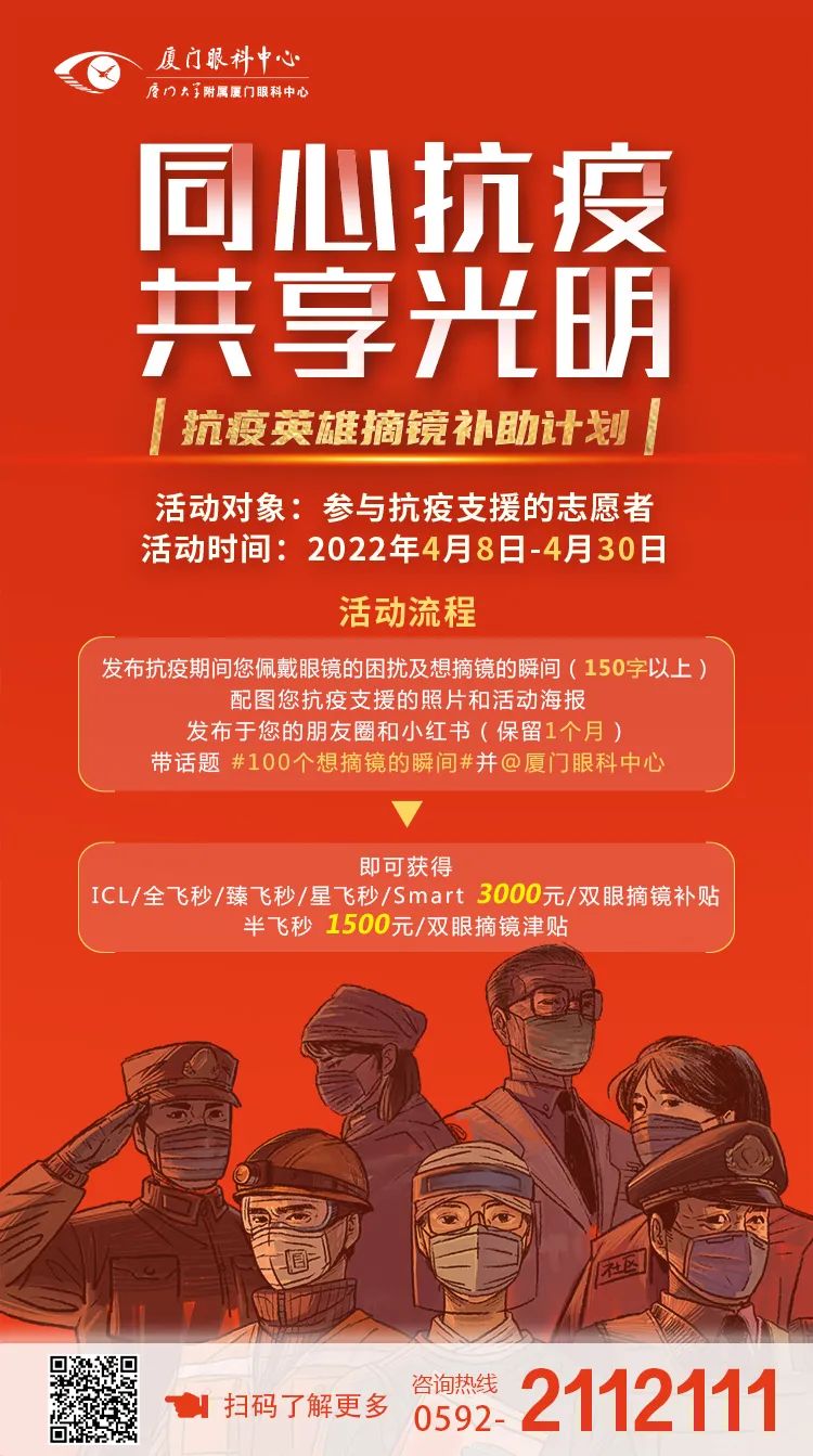 活動內(nèi)容 :發(fā)布抗疫期間佩戴眼鏡的困擾及想摘鏡的瞬間(150字以上)發(fā)布于PYQ和小H書(保留1個(gè)月),配圖您抗疫支援的照片(2 張及以上)和本次活動海報(bào),帶上話題#100個(gè)想摘鏡的瞬間,并@廈門眼科中心,即可獲得摘鏡補(bǔ)貼。