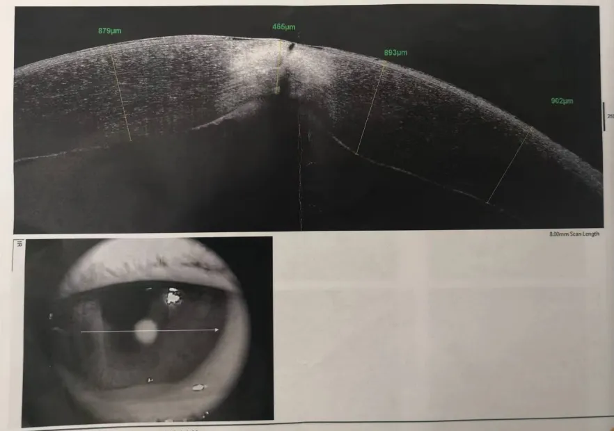 吳護平主任為小黃安排了詳細的檢查。經過檢查,我們確認了小黃為真菌性角膜潰瘍,在小黃角膜中央偏顳下方角膜上可以看到一個約2.2mm的類圓形的灰白色浸潤病灶,遮蓋了部分瞳孔區(qū),深度可達4/5角膜厚度,同時角膜上皮有缺損,基質水腫,表面可以看見少量白色分泌物附著。
