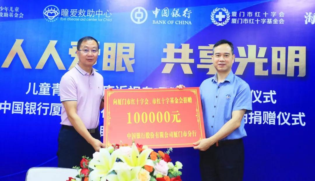 活動(dòng)當(dāng)天,還舉辦了中國銀行股份有限公司廈門市分行、廈門市紅十字會(huì)光明捐贈(zèng)儀式。中國銀行廈門分行積極擔(dān)當(dāng)社會(huì)責(zé)任、履行社會(huì)義務(wù),在愛眼日來臨之際,向廈門市紅十字基金會(huì)捐贈(zèng)10萬元,用于困難眼疾患者的救助。