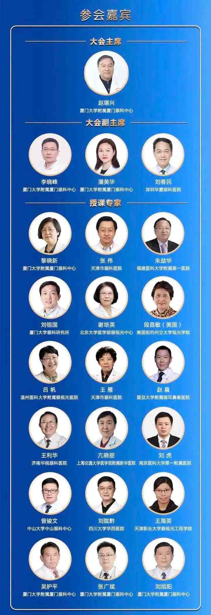授課專家包括國際眼科科學(xué)院院士、亞太地區(qū)斜視與小兒眼科學(xué)會副主席趙堪興教授;國際眼科科學(xué)院院士、廈門眼科中心總院長黎曉新教授;中華醫(yī)學(xué)會眼科學(xué)分會斜視與小兒眼科學(xué)組組長張偉教授;中華醫(yī)學(xué)會眼科學(xué)分會眼視光學(xué)組組長呂帆教授;以及朱益華教授、劉祖國教授、王利華教授、段昌敏教授(美國)、謝培英教授、王雁教授、亢曉麗教授、趙晨教授、劉虎教授、劉隴黔教授、曾駿文教授、潘美華教授、張廣斌教授、吳護平教授、劉旭陽教授、王海英教授等重量級業(yè)界專家和講者。
