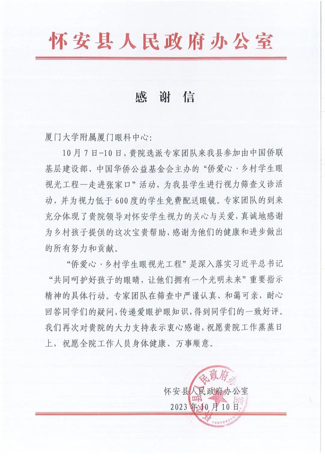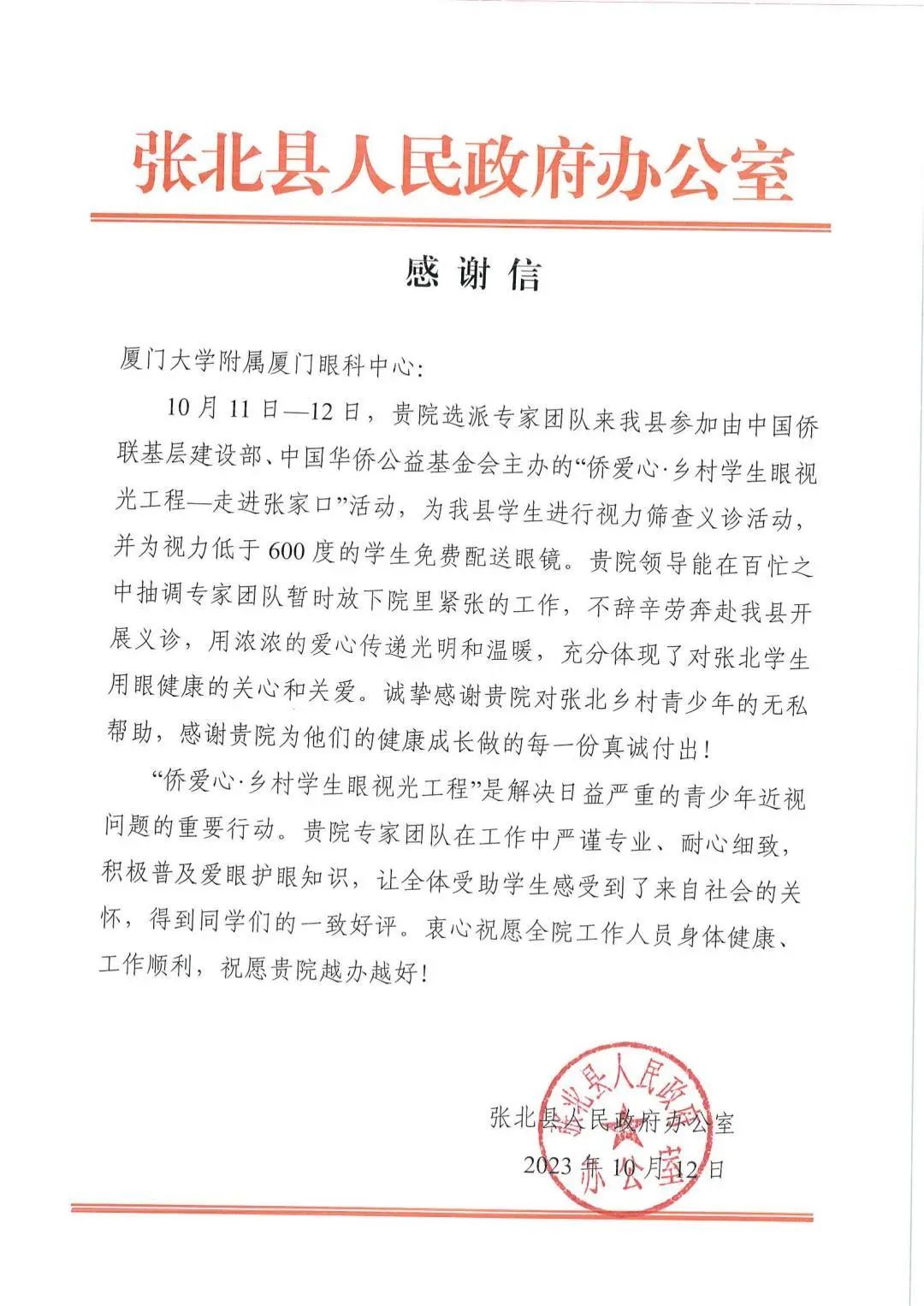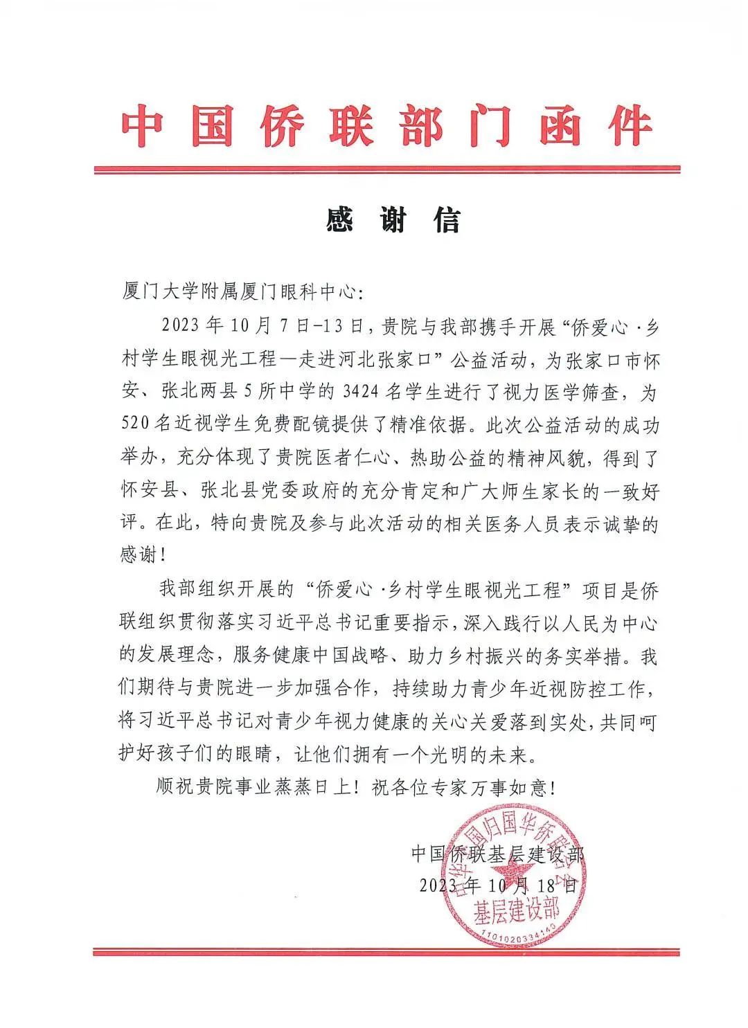 近日,廈門(mén)眼科中心接連收到來(lái)自中國(guó)僑聯(lián)基層建設(shè)部、懷安縣和張北縣人民政府辦公室的三封感謝信,信中對(duì)廈門(mén)眼科中心在“僑愛(ài)心·鄉(xiāng)村學(xué)生眼視光工程-走進(jìn)河北張家口”公益活動(dòng)中的無(wú)私付出及對(duì)鄉(xiāng)村孩子的寶貴的幫助給予充分認(rèn)可與真摯感謝。