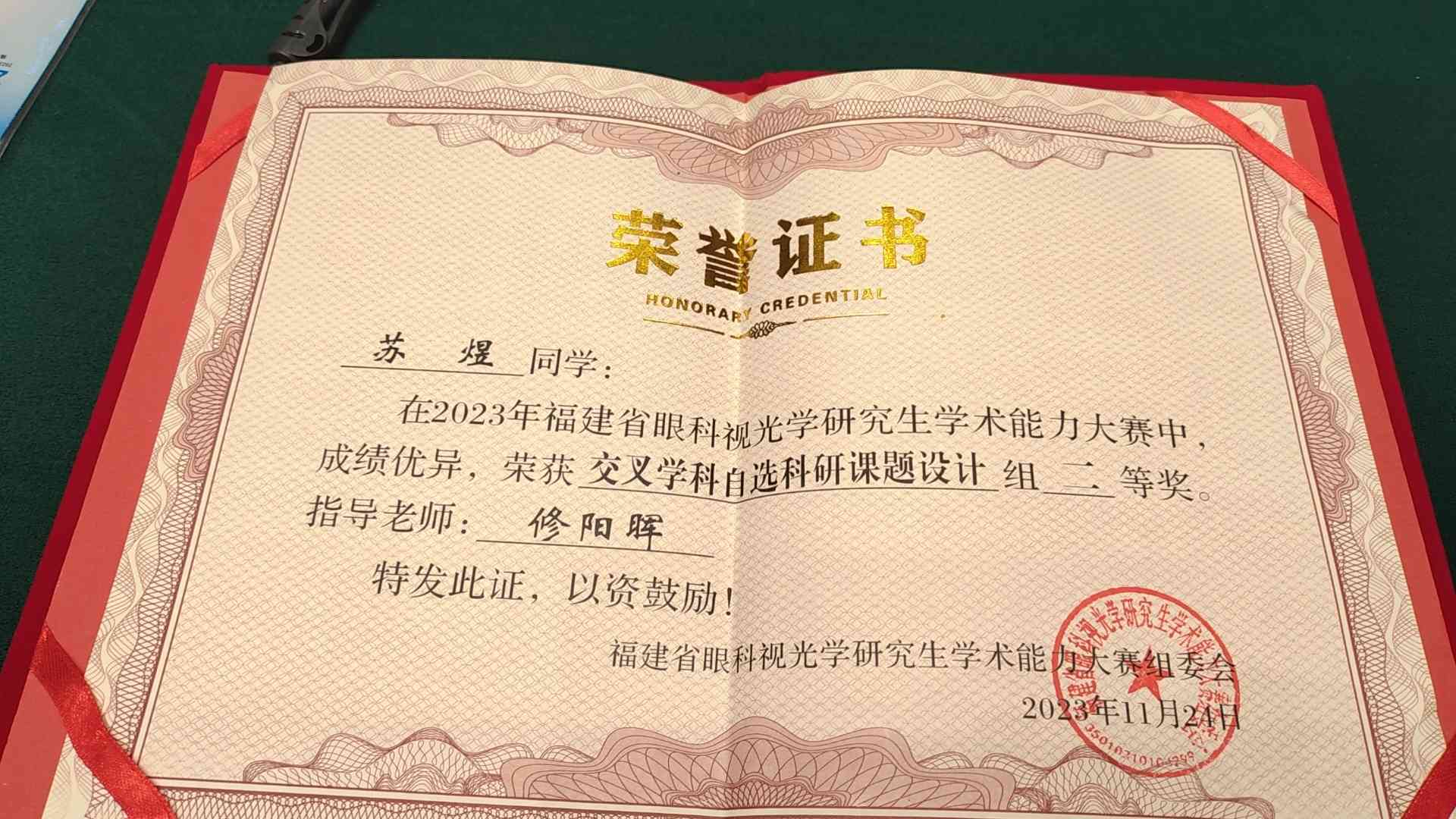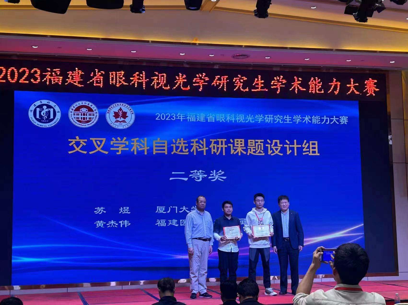 廈門眼科中心斜視與小兒眼病中心修陽暉博士指導(dǎo)的2023級(jí)專業(yè)型碩士研究生蘇煜代表廈門大學(xué)參賽,以嚴(yán)謹(jǐn)?shù)目蒲兴悸放c臨床思維,展現(xiàn)出良好的精神風(fēng)貌和綜合素質(zhì),獲得在場(chǎng)的專家評(píng)委一致好評(píng),最終以總分全省第二的好成績(jī)斬獲“交叉學(xué)科自選課題組二等獎(jiǎng)”。