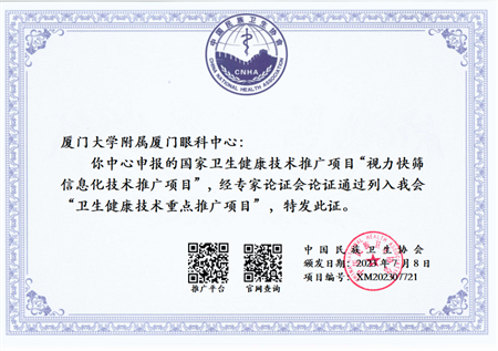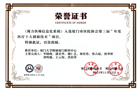 11月25日,在廈門市醫(yī)院協(xié)會(huì)第三屆年會(huì)暨“學(xué)科引領(lǐng)高質(zhì)量發(fā)展”學(xué)術(shù)會(huì)議上,廈門大學(xué)附屬?gòu)B門眼科中心“視力快篩信息化系統(tǒng)”榮獲廈門市醫(yī)院協(xié)會(huì)第三屆“年度醫(yī)療十大創(chuàng)新技術(shù)”項(xiàng)目,同時(shí)“視力快篩信息化技術(shù)推廣項(xiàng)目”經(jīng)國(guó)家衛(wèi)生健康技術(shù)應(yīng)用推廣項(xiàng)目專家論證會(huì)論證,成功入選中國(guó)民族衛(wèi)生協(xié)會(huì)2023年度“衛(wèi)生健康技術(shù)重點(diǎn)推廣項(xiàng)目”。
