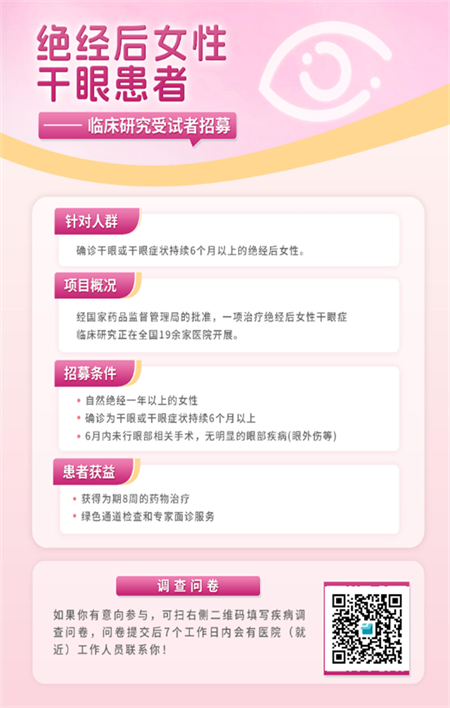 該項臨床研究的組長單位是廈門大學(xué)附屬眼科中心,主要負責(zé)人是劉祖國教授,針對的是確診干眼或干眼癥狀持續(xù)6個月以上的絕經(jīng)后女性。若符合招募條件,成功報名參與后您將獲得為期8周的藥物治療,以及綠色通道檢查和專家面診服務(wù)。