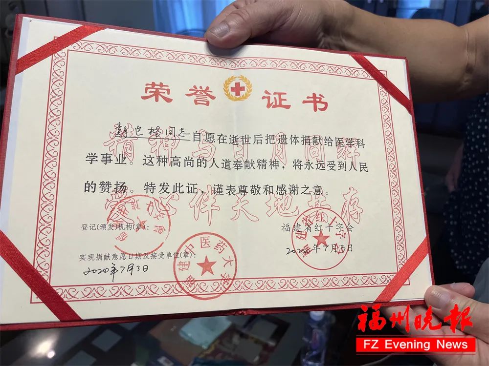 當(dāng)晚9時(shí)多,按照其遺愿,他如愿以償,捐獻(xiàn)有用的器官——眼角膜,并“坐”上開往福建中醫(yī)藥大學(xué)的車子,成為一名大體老師(醫(yī)學(xué)界對(duì)遺體捐贈(zèng)者的尊稱)。