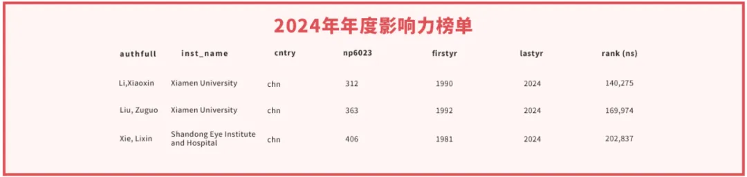 近日,美國斯坦福大學(xué)發(fā)布了第七版《全球前2%頂尖科學(xué)家榜單2024》。國際眼科科學(xué)院院士、廈門眼科中心總院長黎曉新教授、廈門眼科中心院士工作站導(dǎo)師中國工程院院士謝立信教授入選“終身科學(xué)影響力榜單”,同時與廈門眼科中心名譽院長劉祖國教授,三人共同入圍全球“2024年度影響力榜單”!
