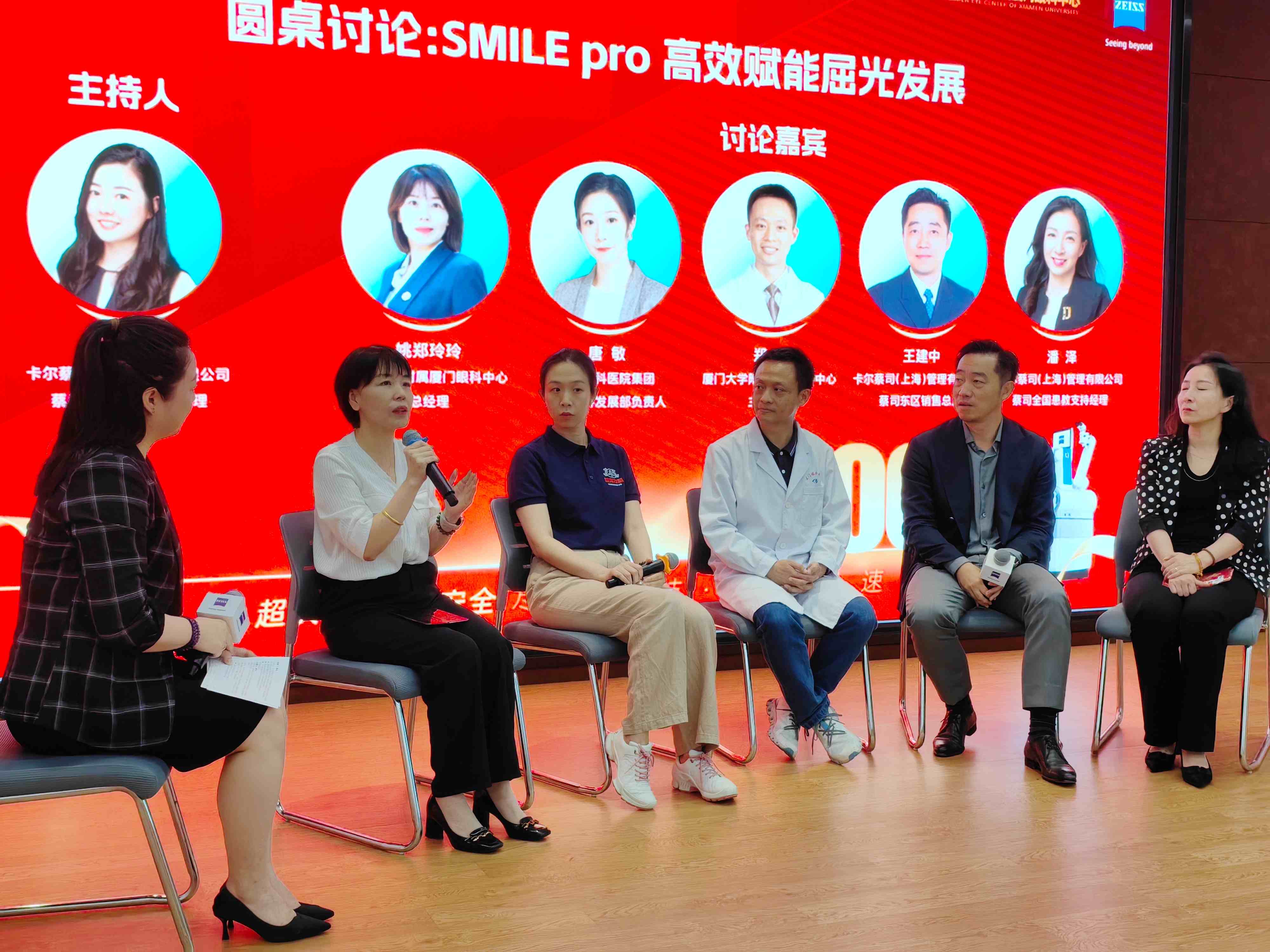 廈門眼科中心總經(jīng)理姚鄭玲玲、華廈眼科醫(yī)院集團(tuán)屈光學(xué)科發(fā)展部負(fù)責(zé)人唐敏、廈門眼科中心屈光科主任醫(yī)師鄭林、蔡司眼科大東區(qū)銷售總監(jiān)王建中、蔡司醫(yī)療屈光全國患教經(jīng)理潘澤等嘉賓,圍繞SMILE Pro技術(shù)在屈光領(lǐng)域的應(yīng)用現(xiàn)狀、未來發(fā)展、提升手術(shù)質(zhì)量與患者體驗等議題展開深度探討: